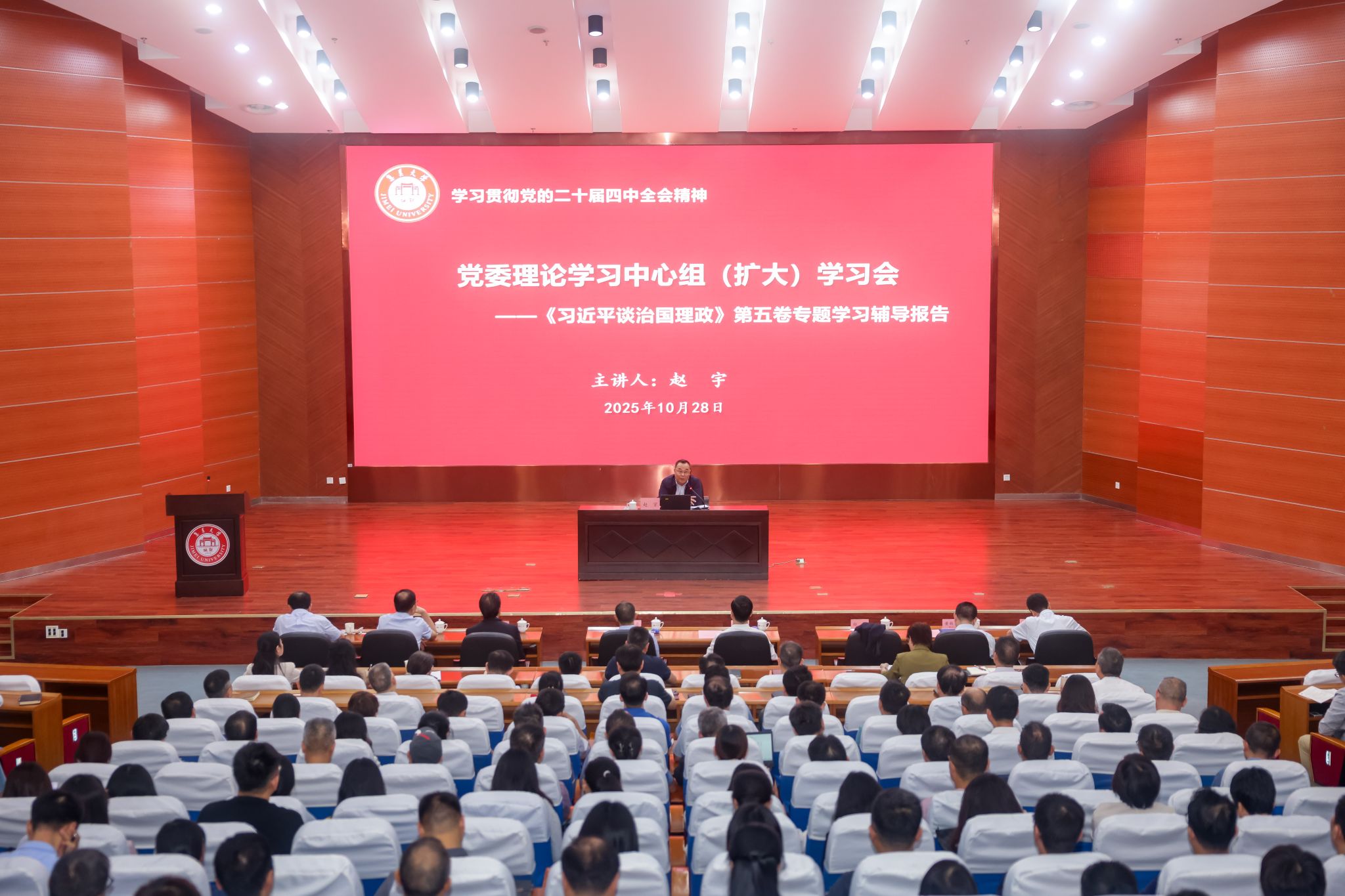 在全国上下深入学习贯彻党的二十届四中全会之际,10月28日下午,我校召开党委理论学习中心组(扩大)学习会。校党委理论学习中心组成员,机关部处、教辅机构及各学院副处级及以上干部,机关科级干部,学院组织员,全体辅导员和学院师生代表参会,会议由校党委副书记郑志谦主持。