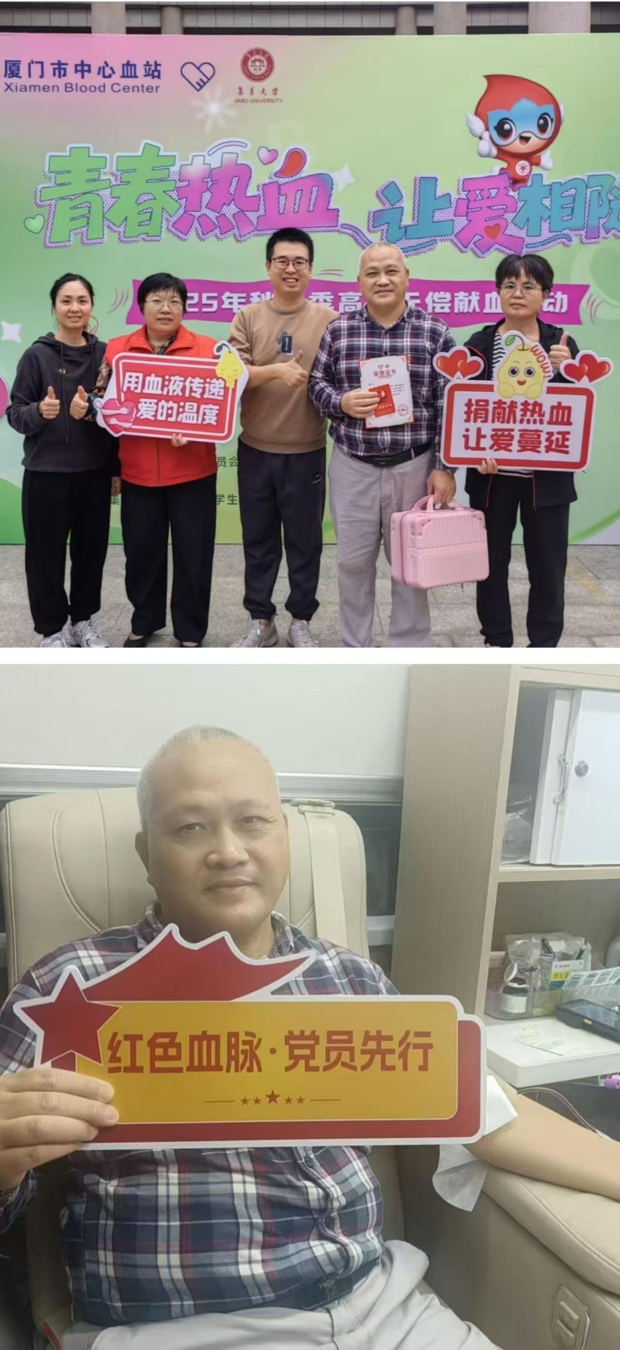 2025年11月13日下午医疗中心党支部组织支部党员在校本部万人食堂广场开展了“红色血脉,党员先行”主题党日活动,支部党员耐心地对献血学生进行了无偿抽血知识宣传。无偿献血是挽救生命的重要途径,每200ml血液可拯救1个生命,通过捐献血液,可以为需要输血的患者(如手术、创伤、血液病患者)提供及时救治,同时,定期献血还能促进自身血液循环,降低血液粘稠度。部分党员带头献了血。