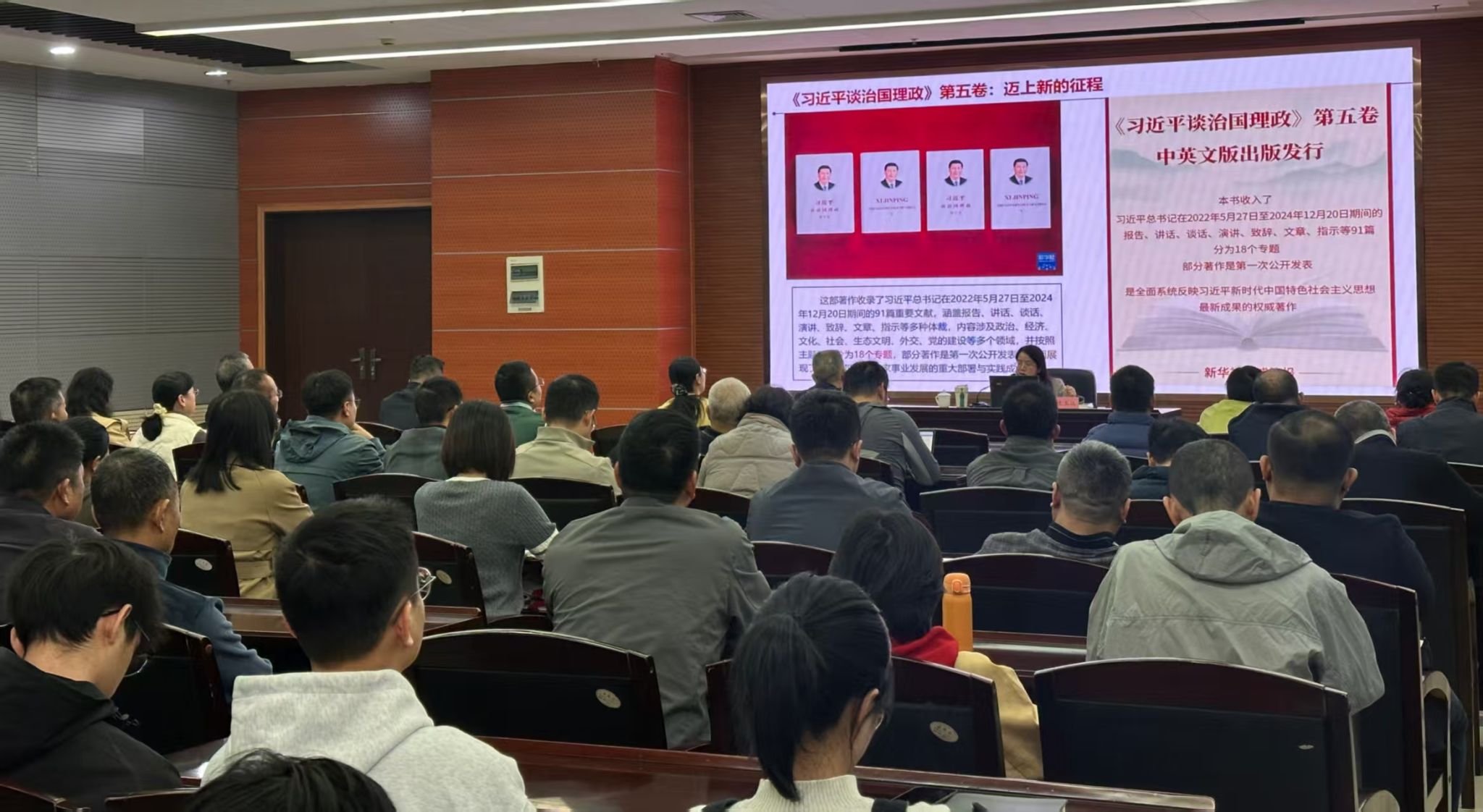 王玉珏教授紧扣《习近平谈治国理政》第五卷核心要义,从“深刻领会重大意义”“准确把握核心要义”“确保学习走深走实”三大维度展开系统阐释。通过剖析著作的时代性、实践性与理论性,结合锚定新时代最大政治、统筹“两个大局”等关键命题,深入解读党的创新理论精髓。报告强调,要以追本溯源的态度、身体力行的实践和融会贯通的思考,将学习成果转化为推动高质量发展的实际成效。
